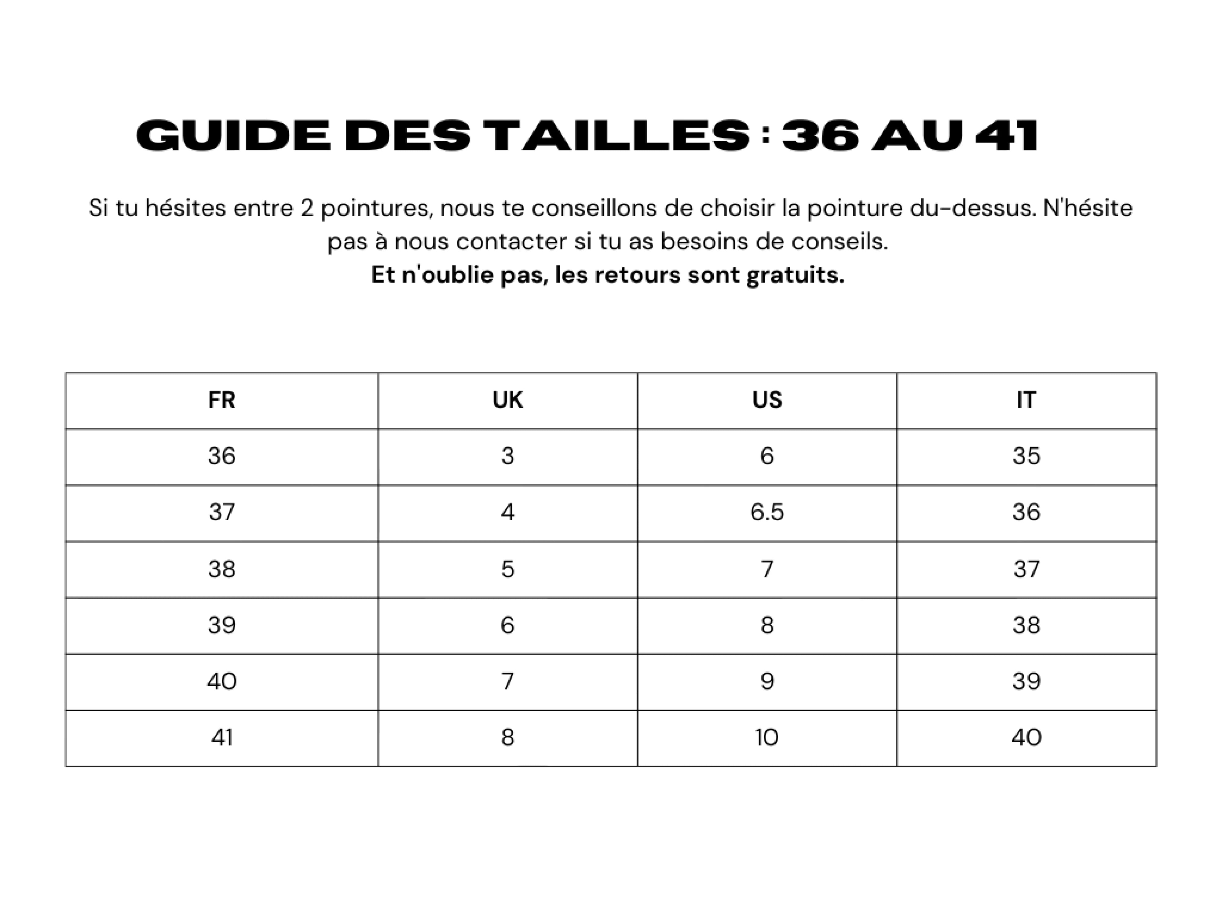 Depending on the model of the shoe, your size may change. And as we are not (yet) present in stores, we are here to guide you as best as possible if you have questions about your ideal size. Here is the size guide for ROBERTO and FERNANDO. And if you still have a few questions, contact us here